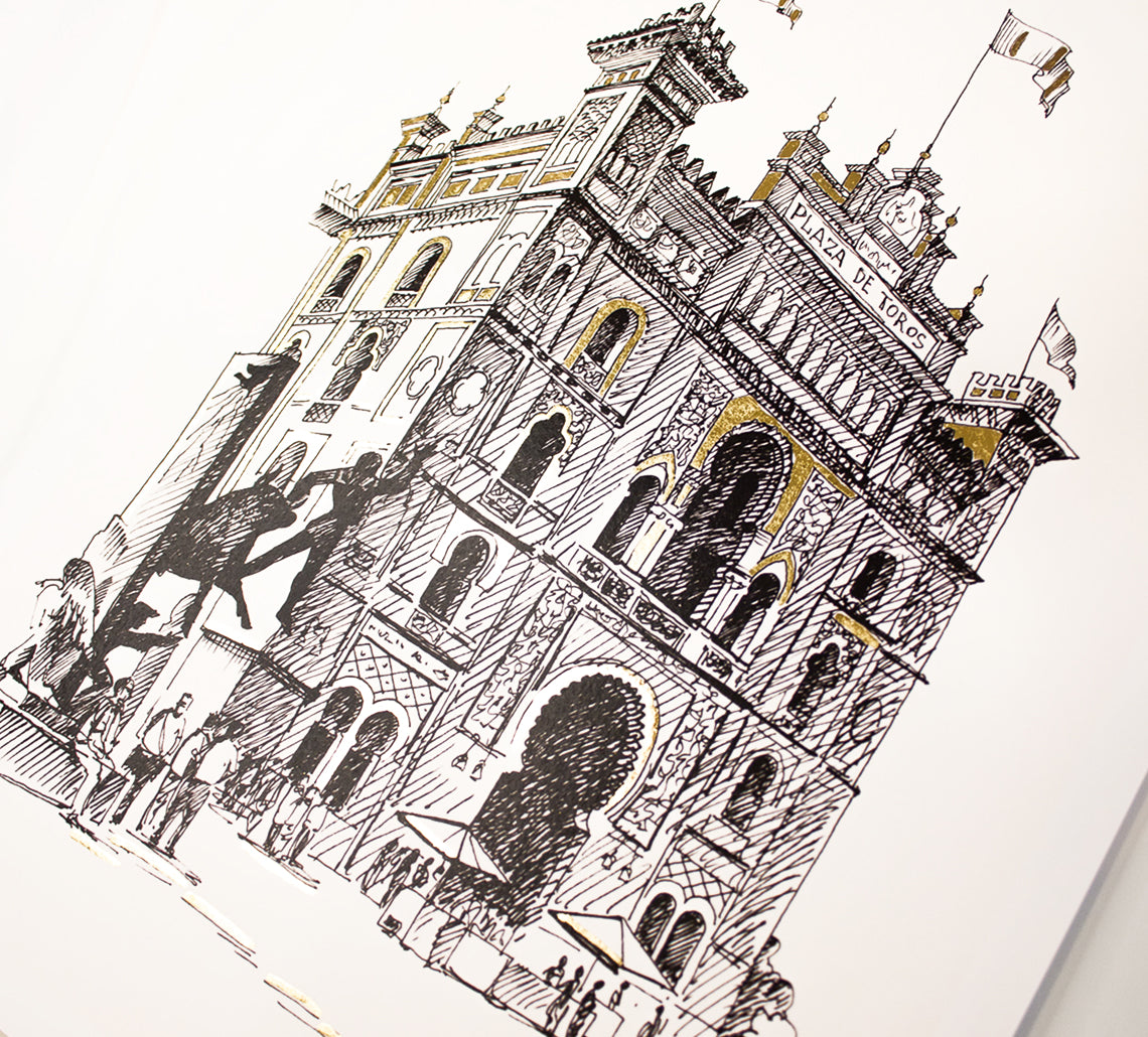 🌆 Prints de alta calidad realizados a partir de un dibujo original en tinta. Cada pieza está intervenida a mano con pintura dorada, lo que convierte cada print en una obra única, a medio camino entre una reproducción y un original. Las ilustraciones representan algunos de los lugares más emblemáticos de Madrid. Cada print está firmado, numerado según la edición y sellado con el sello de la tienda, garantizando su autenticidad.